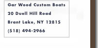 Gar Wood Custom Boats invites you to contact us if you wish to sell or restore your Gar Wood built either in the 20's, 30's, or 40's, or later in the 80's or 90's. We have the expertise to accurately restore your antique Gar Wood to pristine condition as well as first hand knowledge in the maintenance of epoxy encapsulated Gar Woods. We also offer expert brokerage and hauling services to make purchasing or selling your Gar Wood a positive experience. Call or write Tom Turcotte at the address at right. |